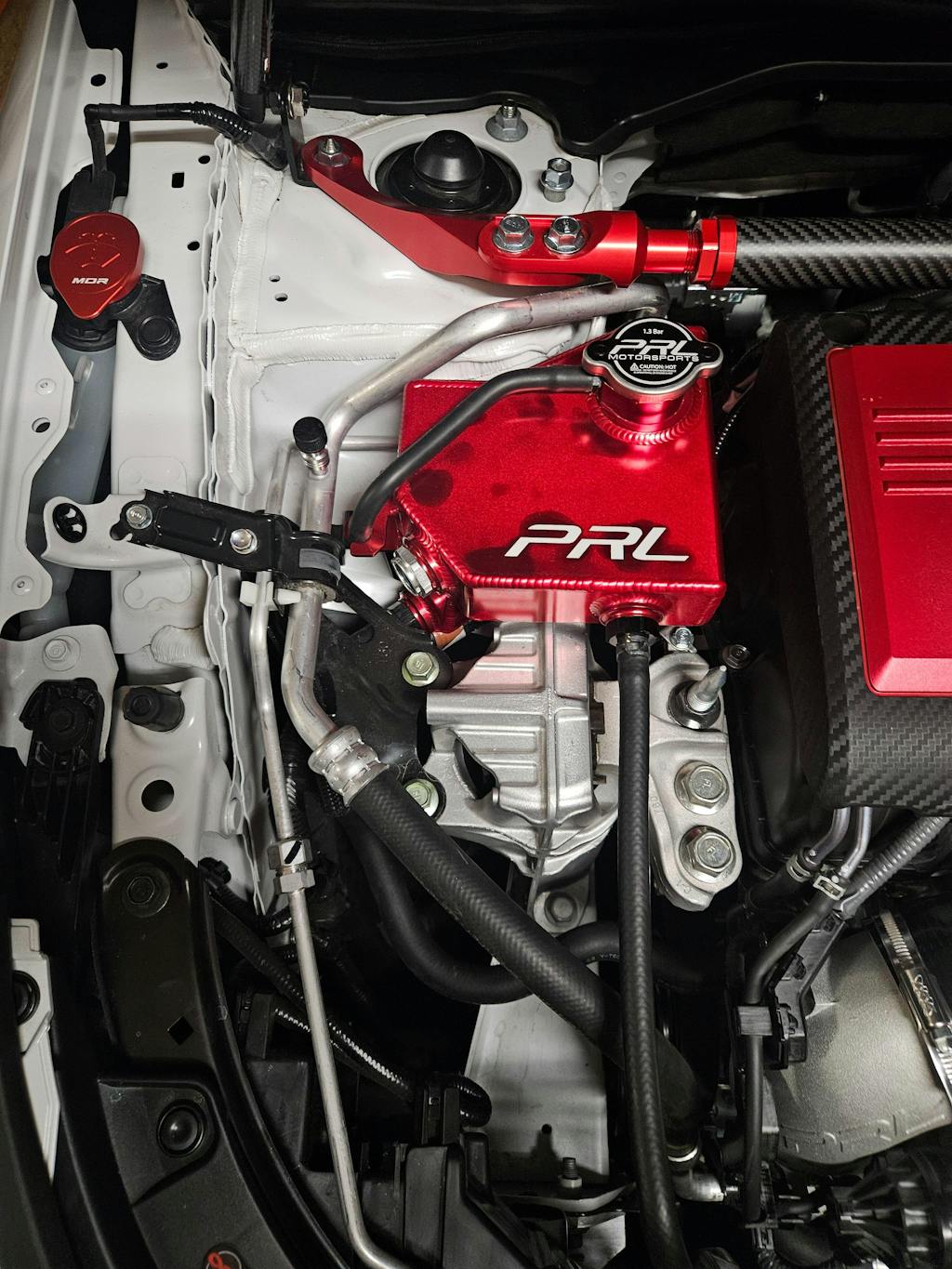 Over time, the factory plastic coolant expansion tanks that Honda/Acura include from the factory can weaken and fail from heat and pressure cycles. The PRL Coolant Expansion Tank kit replaces the factory tank with a more robust aluminum version. Our 6061 aluminum tank will not be effected by temperature and can hold higher pressures so it will out-last the factory tank. Our reservoir also more than doubles the tank's coolant capacity to 1.32 quarts (1.25 liters), while the stock tank only holds .58 quarts (.55 liters) allowing for a greater volume of coolant to carry heat away from the engine internals while maintaining a tidy engine bay.